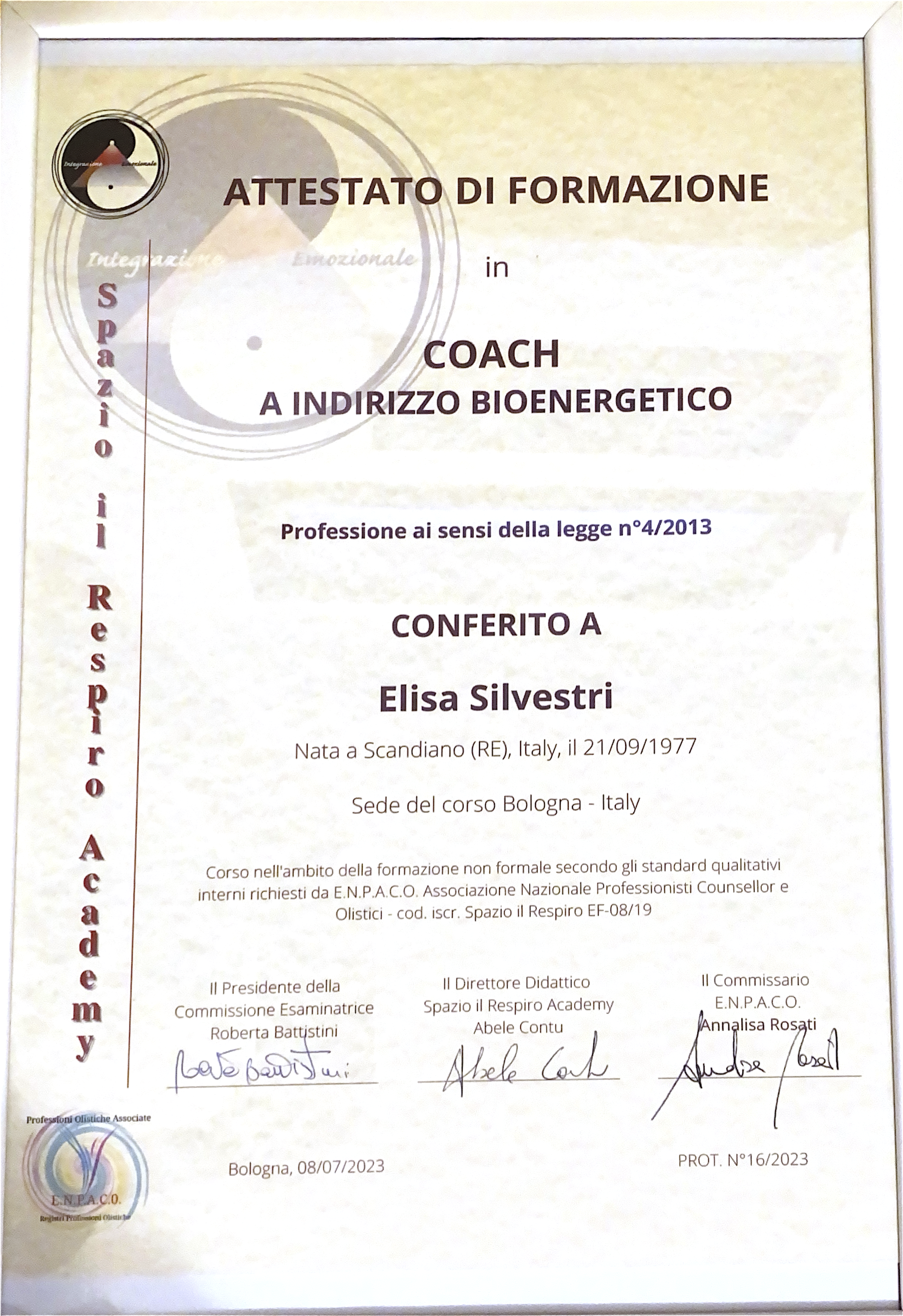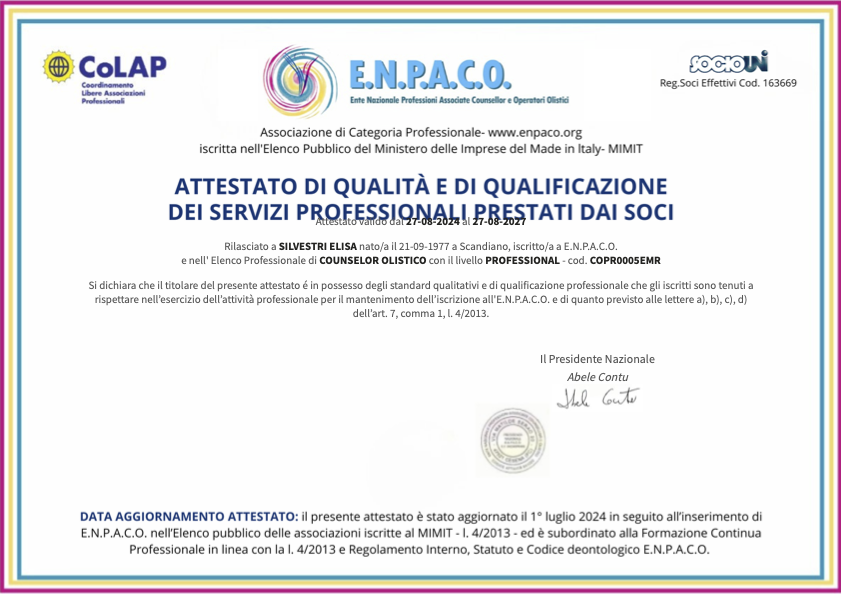 Dopo quasi 20 anni di lavoro interiore e ricerca esistenziale, sono arrivata al mio percorso formativo triennale in Counseling che integra mente, corpo ed emozioni nel raggiungimento della propria consapevolezza, grazie all’approccio Gestaltico, Olistico e a Mediazione Corporea. Fin da bambina ho sentito una naturale inclinazione all’ascolto e al supporto dell’altro; diventare Counselor è stato il modo più autentico per esprimere la mia essenza e il compimento di un richiamo interiore che mi ha permesso di trasformare la mia sensibilità e predisposizione in una professione consapevole.